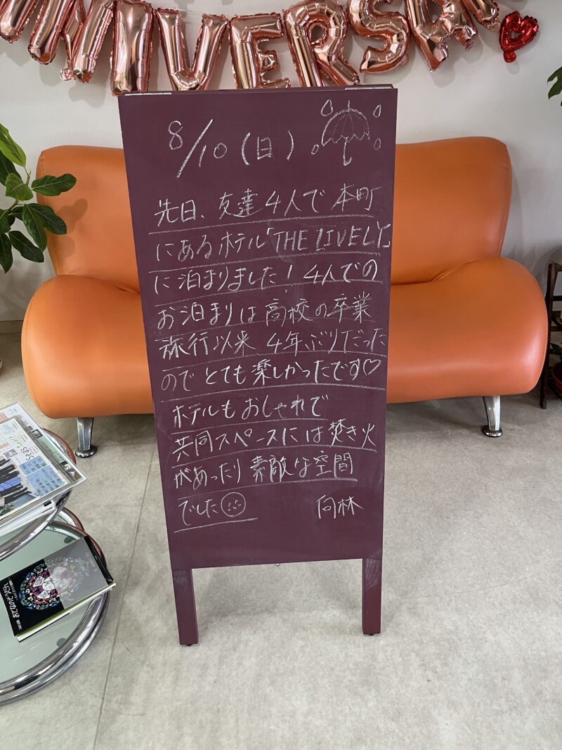 先日友達4人で本町にあるホテル「THE LIVELY」に泊まりました!4人でのお泊まりは高校の卒業旅行以来4年ぶりだったのでとても楽しかったです💓ホテルもおしゃれで共同スペースには焚き火があったり、素敵な空間でした✨