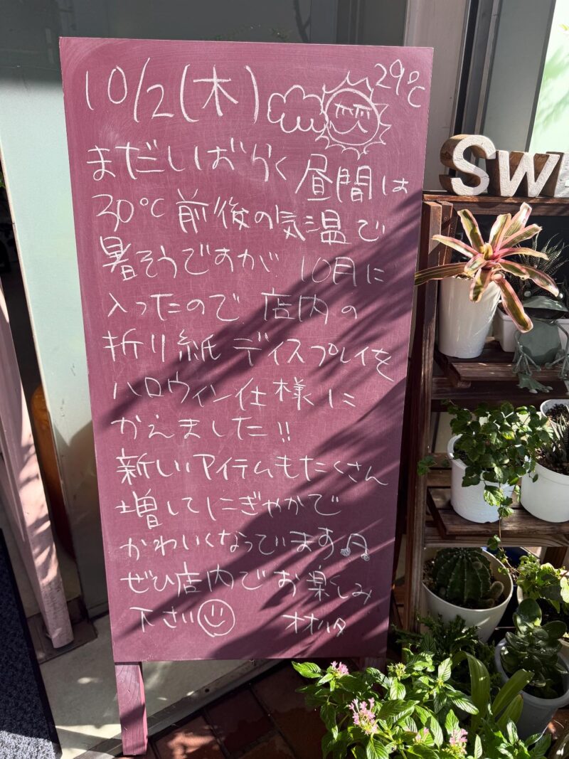 まだしばらく昼間は30°C前後の気温で暑そうですが、10月に入ったので店内の折り紙ディスプレイをハロウィン仕様にかえました!!