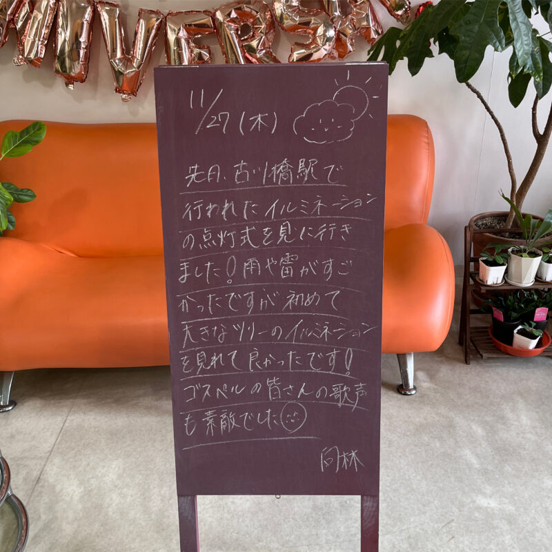 先日古川橋駅で行われたイルミネーションの点灯式を見に行きました!雨や雷がすごかったですが初めて大きなツリーのイルミネーションを見れて良かったです!✨ゴスペルの皆さんの歌声も素敵でした💓