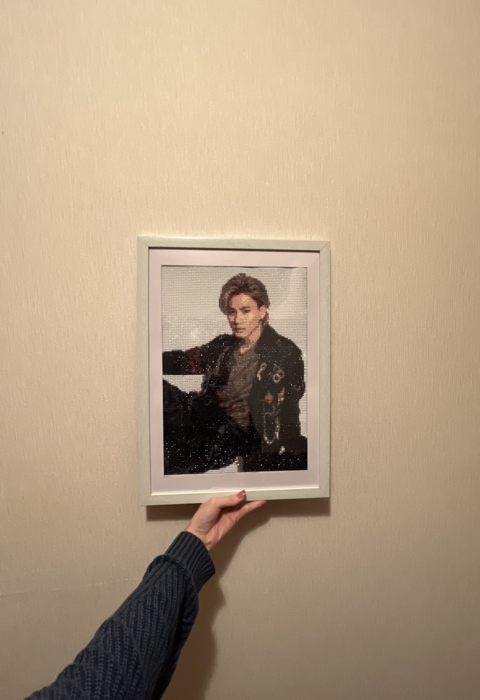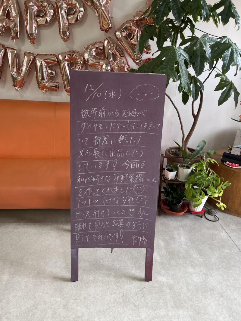 数年前から祖母がダイヤモンドアートにはまっていて、部屋に飾ったり文化展に出品したりしています!今回は私が好きな平野紫耀くんを作ってくれました🥰一つ一つ小さなダイヤモンドビーズを付けていくので少し離れてみると写真のように見えて綺麗です✨