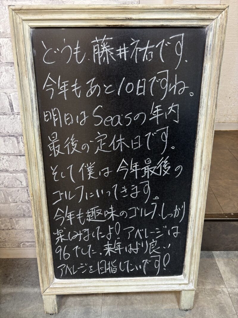 今年もあと10日ですね。明日はSea’sの年内最後の定休日です。そして僕は今年最後のゴルフにいってきます。