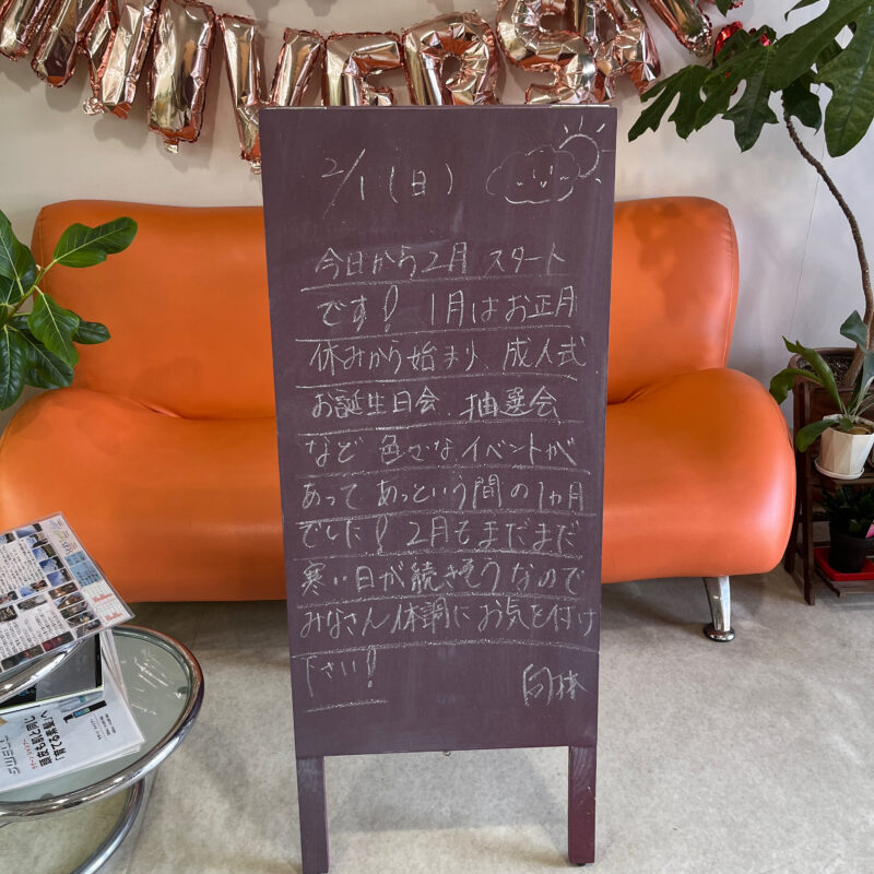 今日から2月スタートです!1月はお正月休みから始まり、成人式、お誕生日会、抽選会など色々なイベントがあってあっという間の1ヶ月でした!2月もまだまだ寒い日が続きそうなのでみなさん体調にお気を付け下さい!