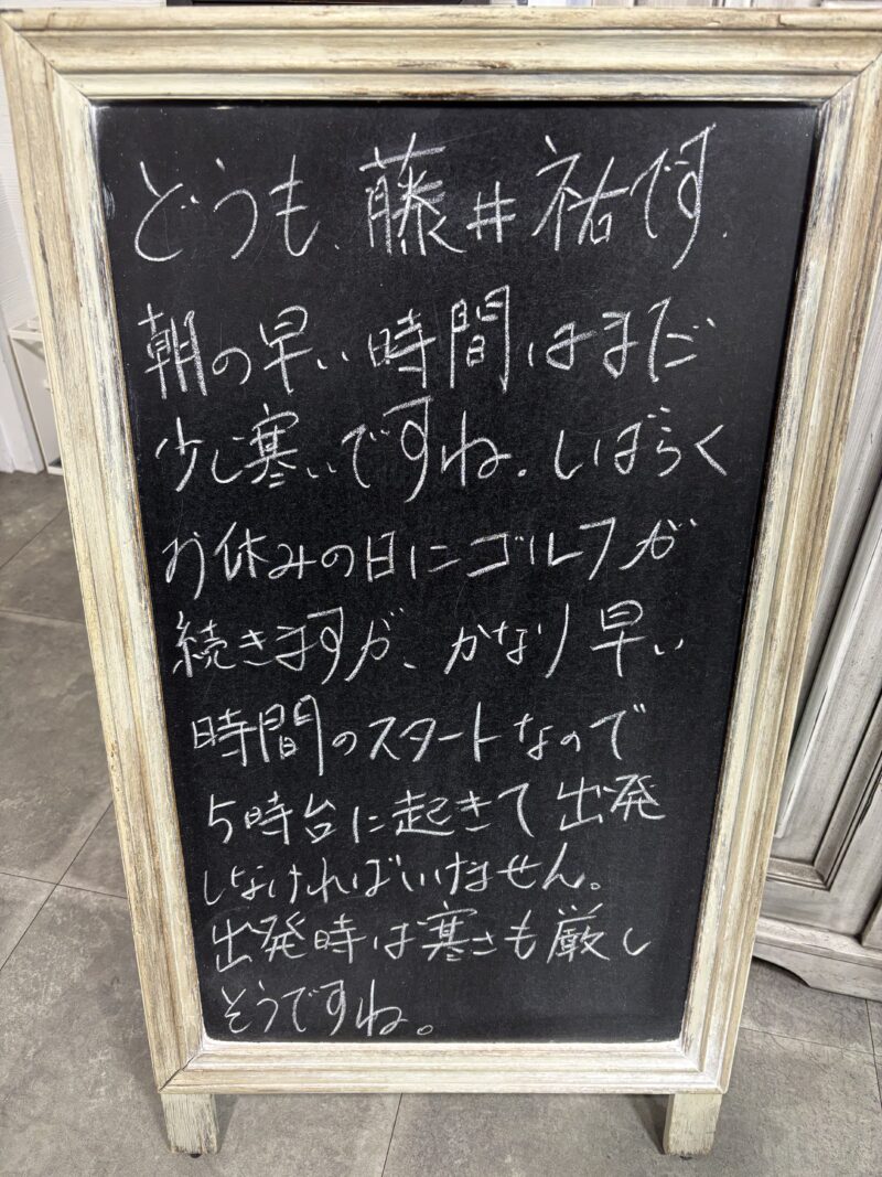 朝の早い時間はまだ少し寒いですね。しばらくお休みの日はゴルフが続きますが、かなり早いスタートなので5時台に起きて出発しなければいけません。出発時は寒さも厳しそうですね。
