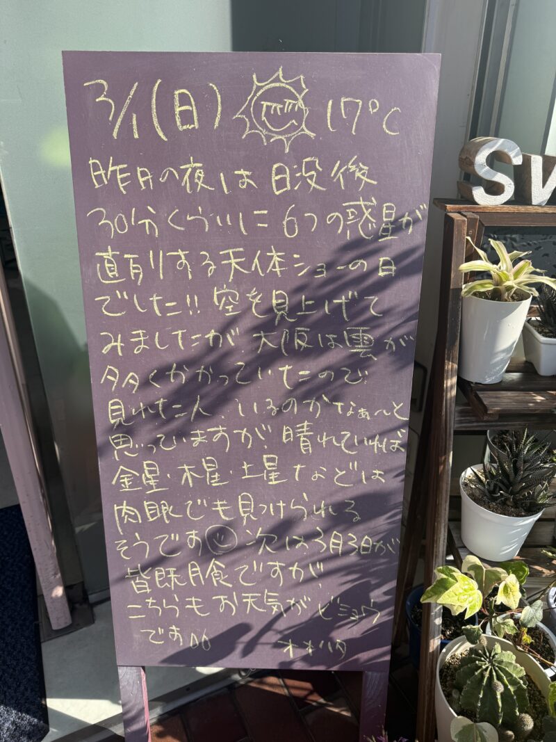 空を見上げてみましたが、大阪は雲が多くかかっていたので見れた人いるのかなぁ~と思っていますが、晴れていれば金星・木星・土星などは肉眼でも見つけられるそうです😃