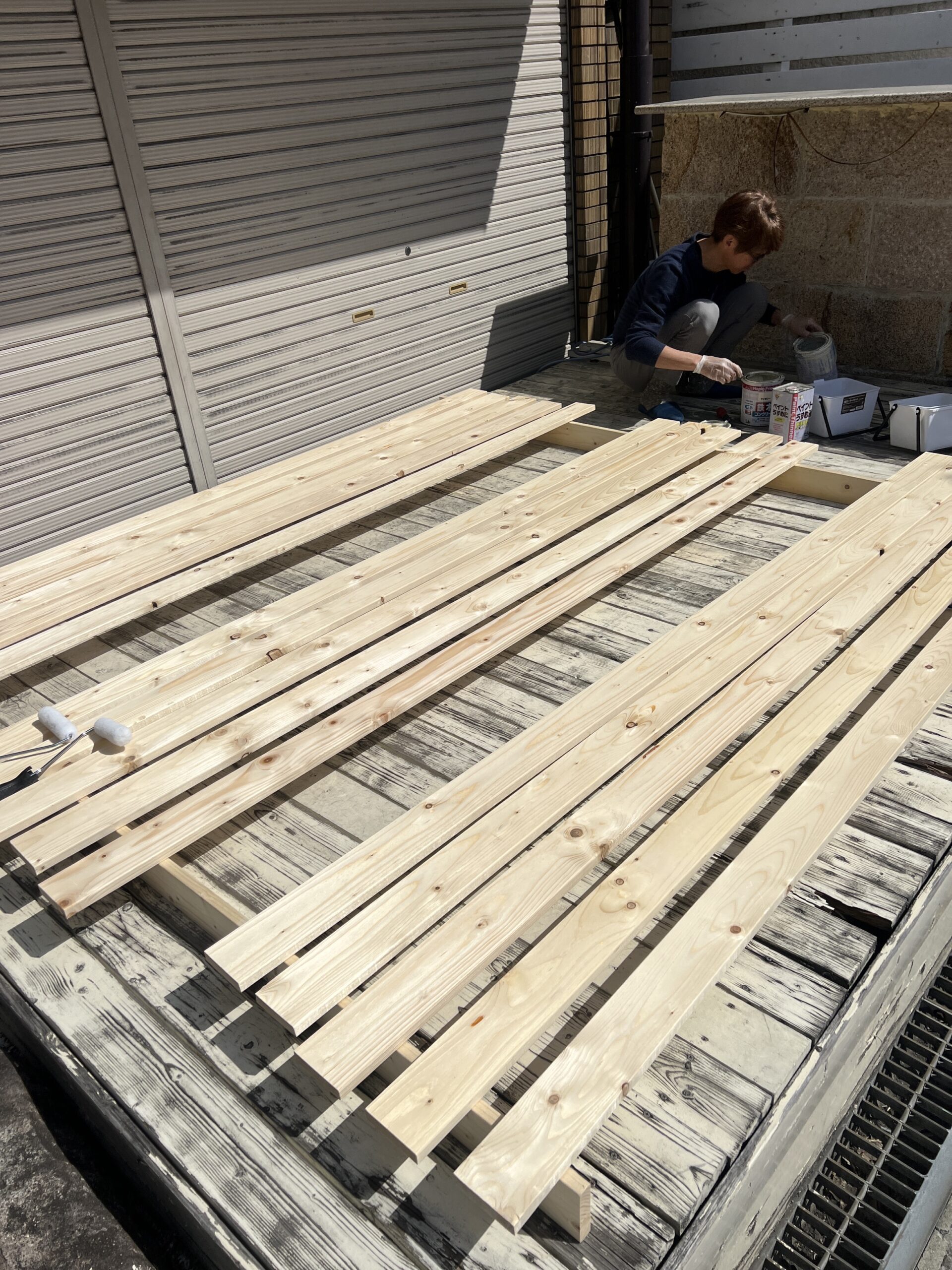 火曜日はウッドデッキの張り替えのため、まず木板をペンキで塗りました!