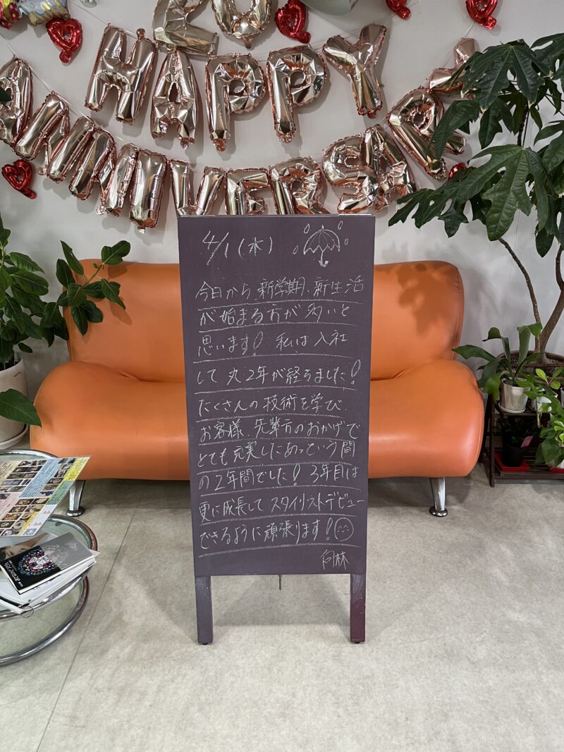 今日から新学期、新生活が始まる方が多いと思います!私は入社して丸2年が経ちました!たくさんの技術を学び、お客様、先輩方のおかげでとても充実したあっという間の2年間でした!3年目は更に成長してスタイリストデビューできるように頑張ります!✨